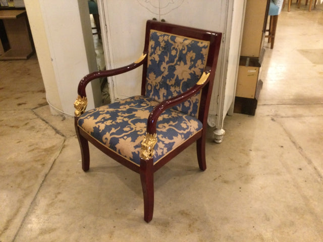 PAIR - 24"w mahogany lacquer finish w/ blue and gold damask fabric and gold accents, some wear.