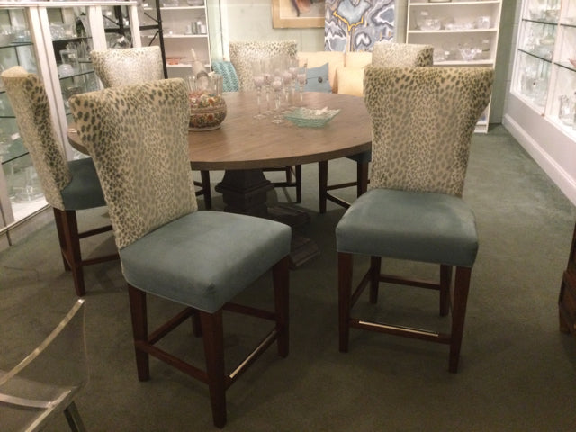 PAIR -- 24"H pale aqua seat w/ cream and aqua leopard back on dark wood frame