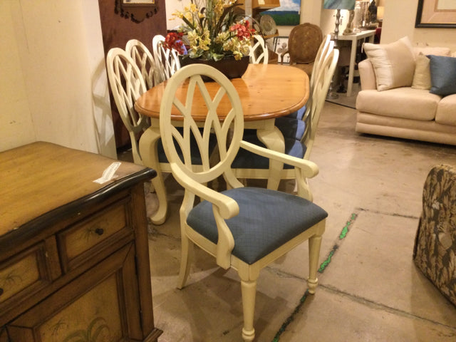 set of 8 cream open work oval backs w/ blue seats, some wear.